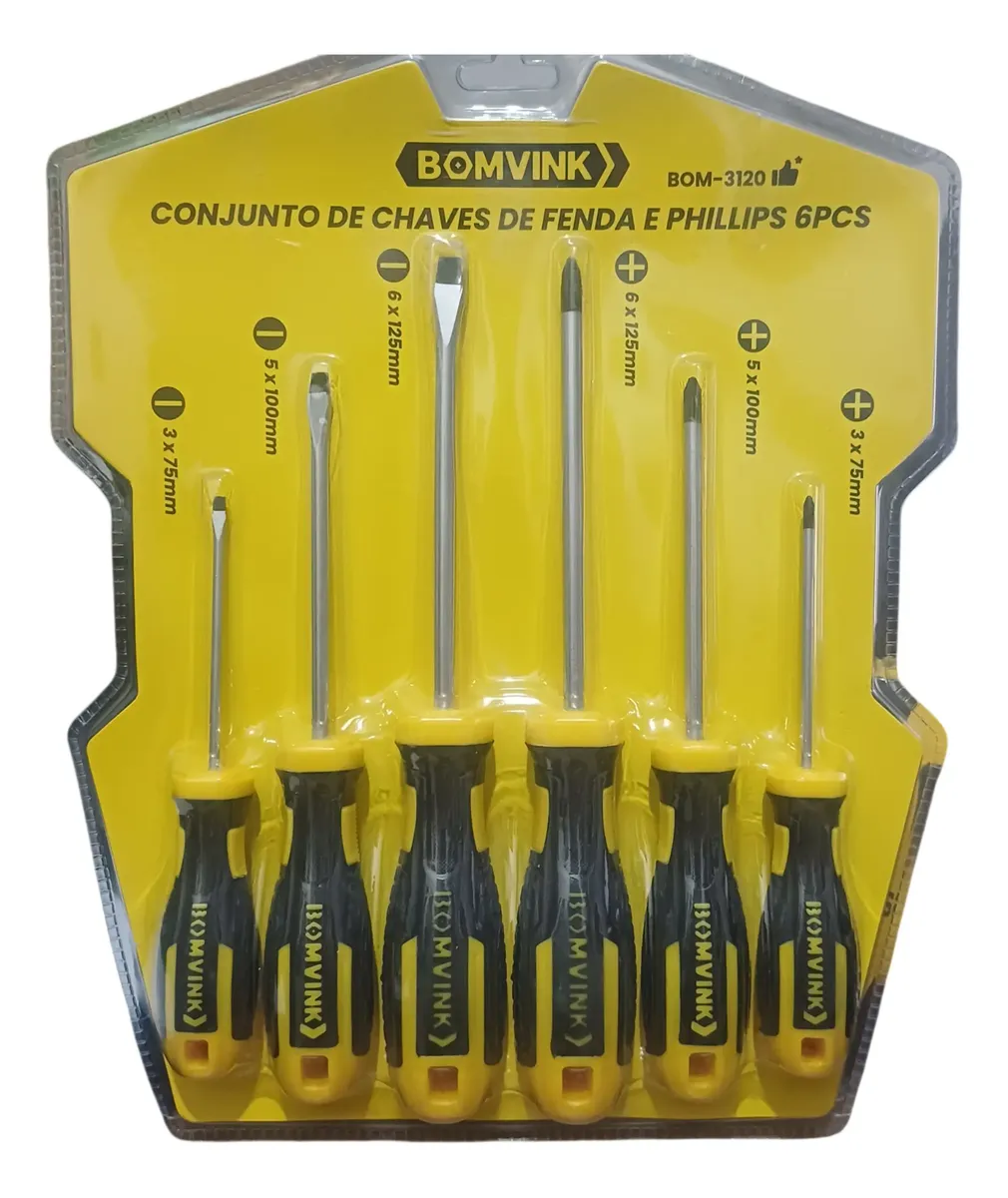 Conjunto de Chaves de Fenda e Phillips BOMVINK – 6 Peças O kit de chaves BOMVINK é ideal para quem busca praticidade e resistência no dia a dia, seja para uso profissional ou doméstico. Composto por 6 peças (fenda e Phillips), ele atende às necessidades básicas de manutenção, montagem e reparos em geral. Destaques do produto: Kit completo com 6 chaves: inclui modelos de fenda e Phillips para diferentes tipos de parafusos Alta durabilidade: hastes em aço resistente, feitas para suportar uso contínuo Cabos ergonômicos: design anatômico que proporciona firmeza e conforto no manuseio Ótima precisão: pontas bem acabadas para melhor encaixe e menos desgaste do parafuso Marca confiável: qualidade BOMVINK Perfeito para ter em casa, na oficina ou no trabalho, esse conjunto oferece excelente custo-benefício para quem precisa de ferramentas versáteis e duráveis. Por que comprar com a gente? -Envio rápido -Produto bem embalado -Atendimento personalizado -Nota fiscal para pessoa física ou jurídica